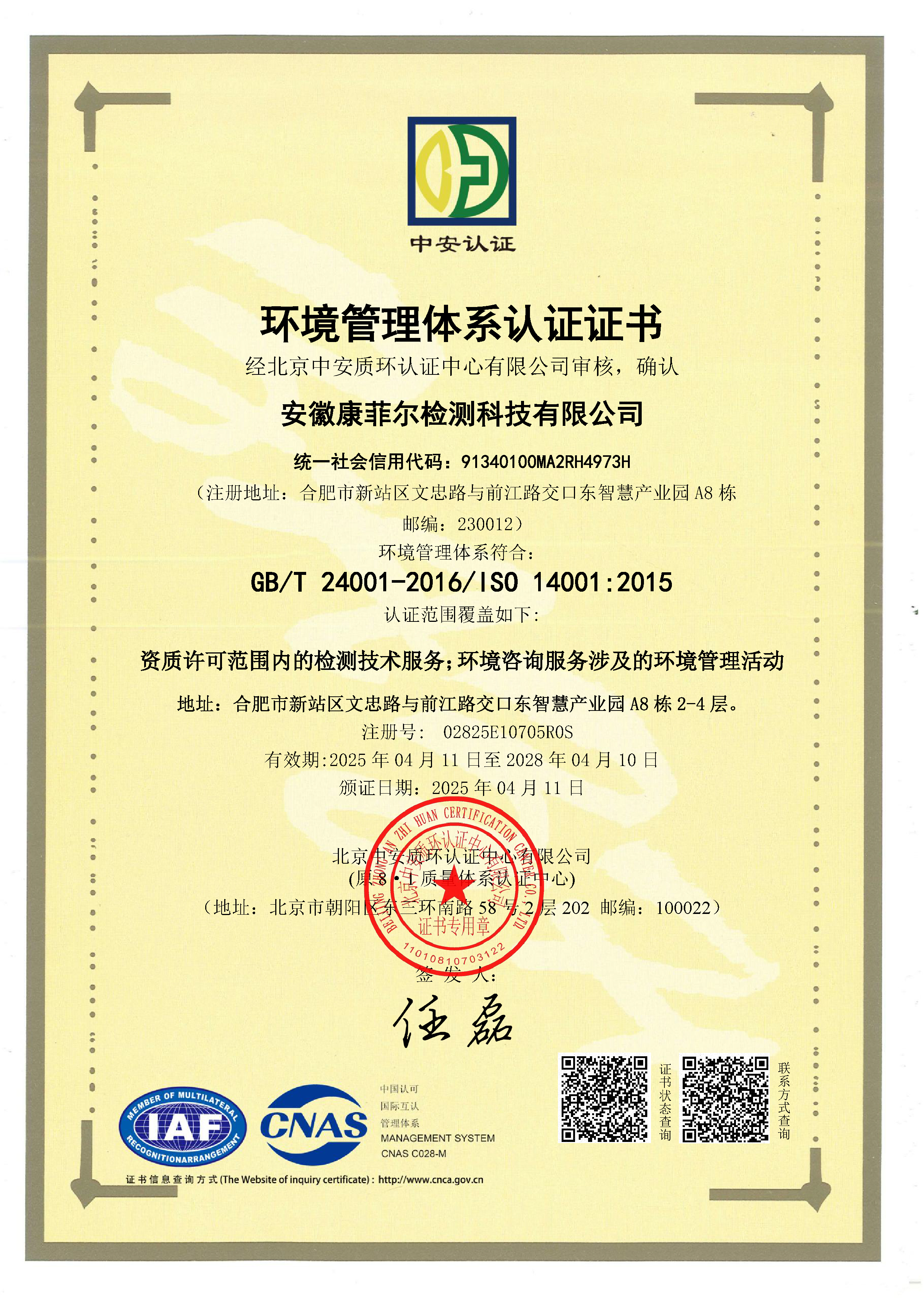 環境管理體系認證證書